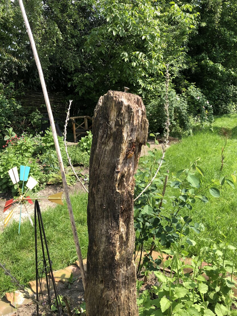 Als Hotspot Zone habe ich zwei Bereiche von der humosen Erde befreit und neue Lebensbereiche gestaltet. Ein Sandarium entstand an einer sehr sonnigen Stelle. Hier hat der ca. 10 qm große Bereich fast den ganzen Tag Sonne. Einige Totholzelemente werden gerne von Hornissen genutzt. Ein weiterer sandig, trockener Bereich entstand dann an der östlichen Grundstücksgrenze in der Nähe des Teiches. Holz und Stein sollen auch Amphibien dienen. Gesehen habe ich schon Molche und den Grasfrosch.
