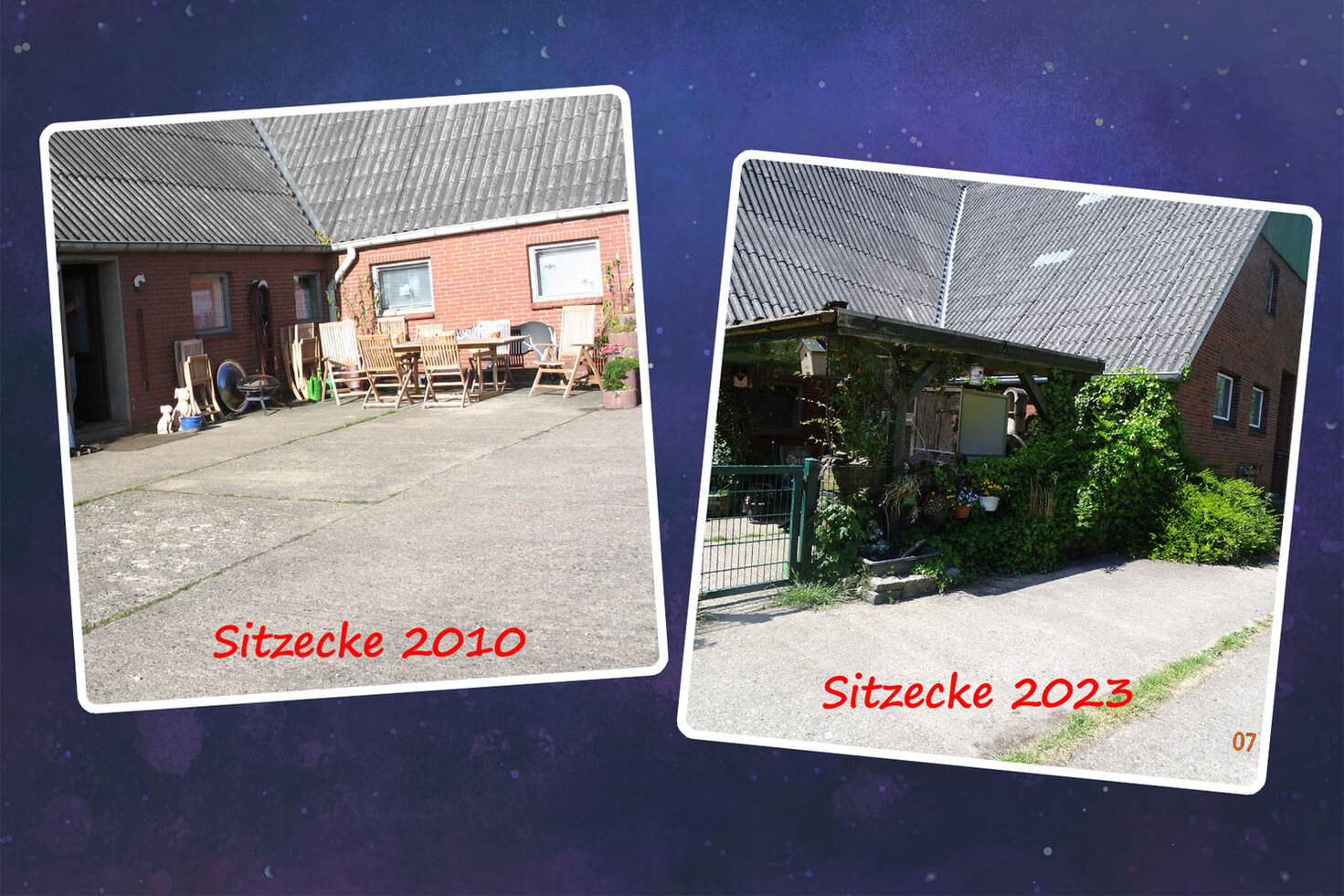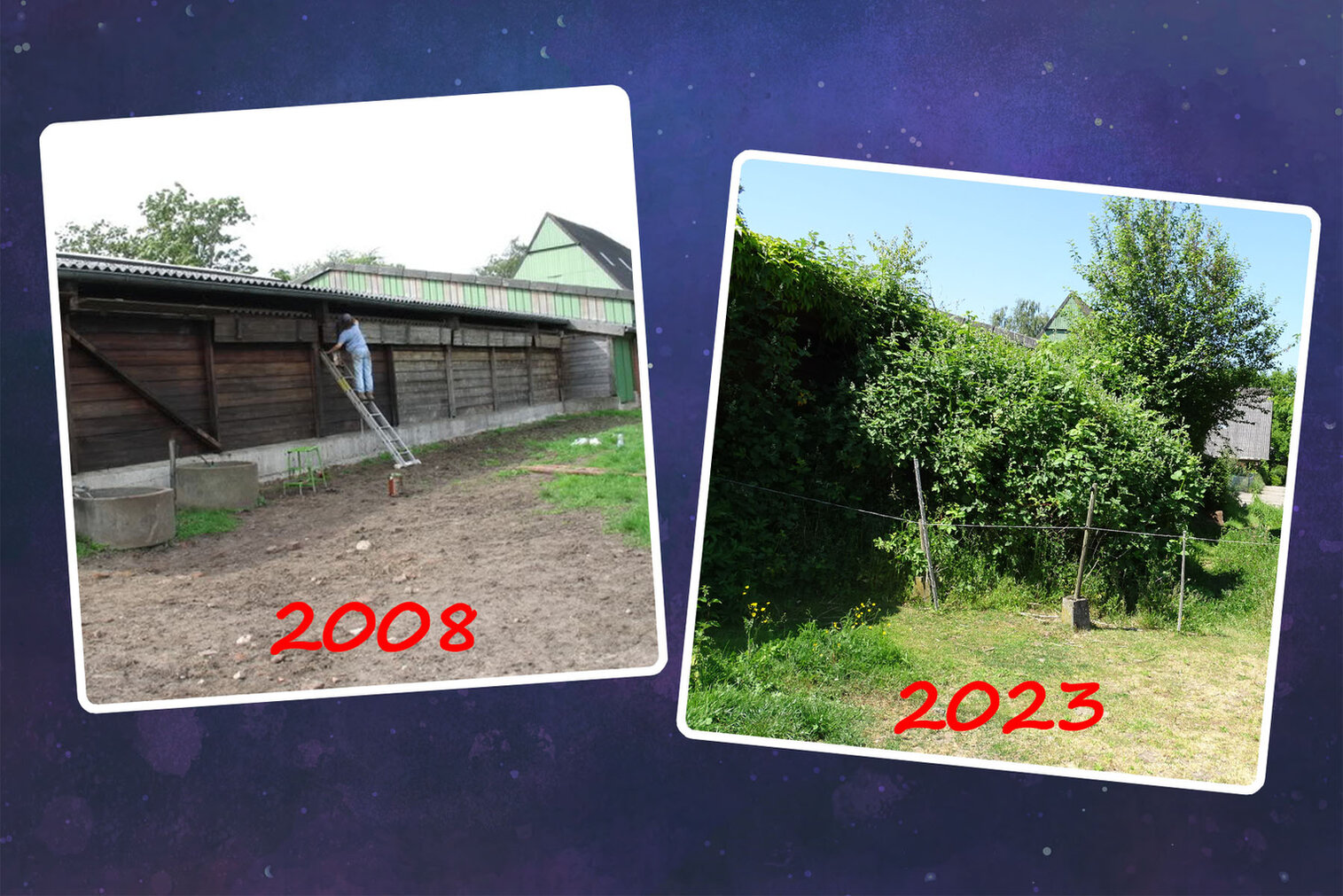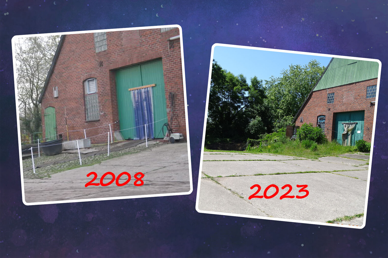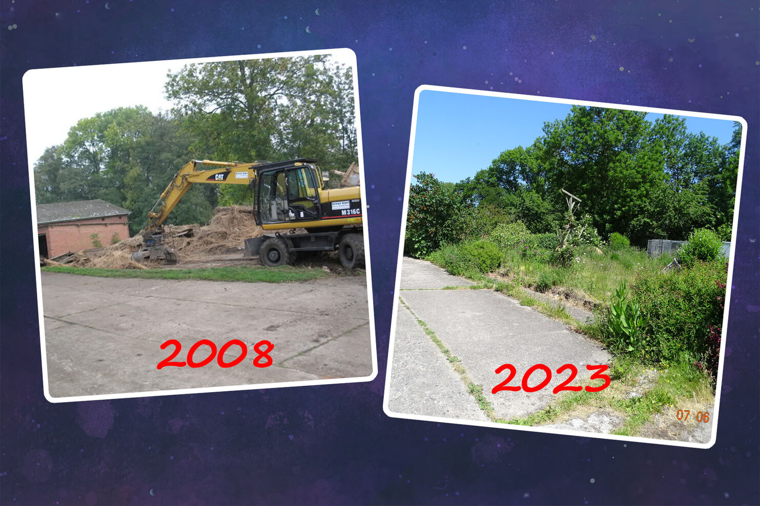 Trailplatzfläche: vor dem Kauf hat noch der Vorbesitzer als zudem priviligierter Landwirt eine uralte, vollständig baufällige, einsturzgefährdete Scheune abreißen lassen, da ich als Neuzugezogene sonst ggf. mit Denkmalschutzauflagen zu tun bekommen hätte