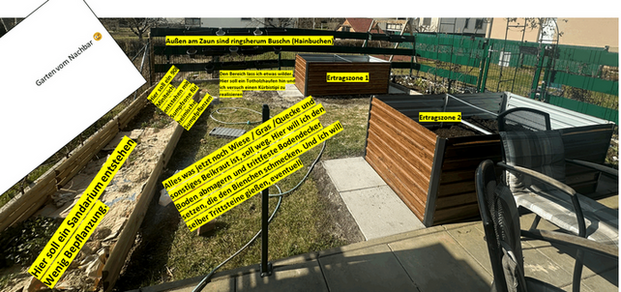 Auf der Terrasse anschließend am Sandarium (den Bereich der Terrasse sieht man am Foto nicht) kommen zwei große Blumentröge hin, da will ich irgendwas Kletterndes rein haben, vielleicht heimische Clematis oder wilden Wein.