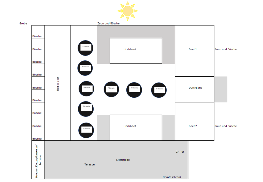 Trittplatten gießen. Die Idee ist, dass der Garten irgendwann nur noch dort betreten wird, wo Trittplatten sind und der Rest wachsen darf bzw. dort sinnvolle, magere Standort liebende Pflanzen gesetzt werden und der Garten im Laufe der Jahre ein Selbstläufer wird.