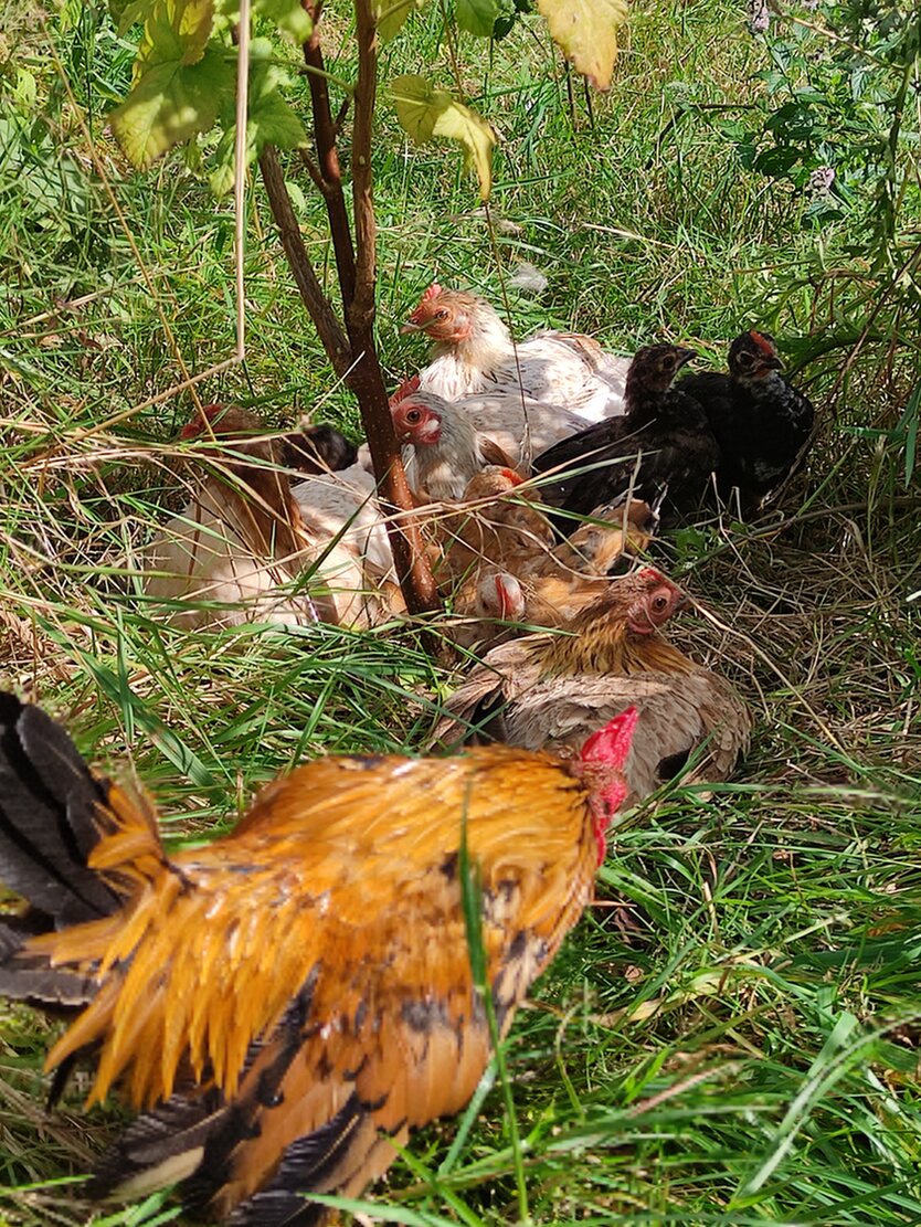 Unsere Hühnerschar bei der Gartenpflege und -Gestaltung.