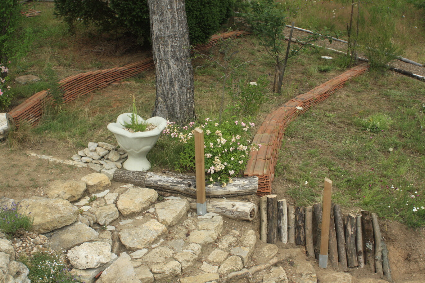Boden und Pflanzen: Laut Beschreibung der Pflanzen, die derzeit gut gedeihen, ist der Boden sowohl nährstoffreich wie nährstoffarm als auch basisch und sauer. (Karthäusernelke, Kleines Habichtskraut, Natternkopf, Leimkraut, Weißes Labkraut) Also: Alles kann, Nichts muss. Im unteren Swale stehen Schwarzkiefer (ca. 40 Jahre), Aronia, Quitte und Süßkirsche seit vier Jahren; im Oberen eine ev. "Rote" Mirabelle (Wird sich dieses Jahr zeigen. War eine Rettung aus dem Nachbargarten.) seit zwei Jahren, die ca. 40jährige Eibe, eine Kiefer von ca. 16 Jahren. Im östlichen Wiesenteil steht eine gleichaltrige Kiefer und eine Weymouthskiefer von ca. 40 Jahren. Seit dort Wiese ist, lege ich die Herbstmahd so, dass ich mit dem Mahdgut auch die Nadeln runternehme; ggf. harke ich noch mal nach. Vorher wurden die Nadeln beim Mähen oder durch Harken entfernt. Es kann also nicht übermäßig sauer sein - sagt auch die Nesselblättrige Glockenblume unter der kleinen Kiefer.