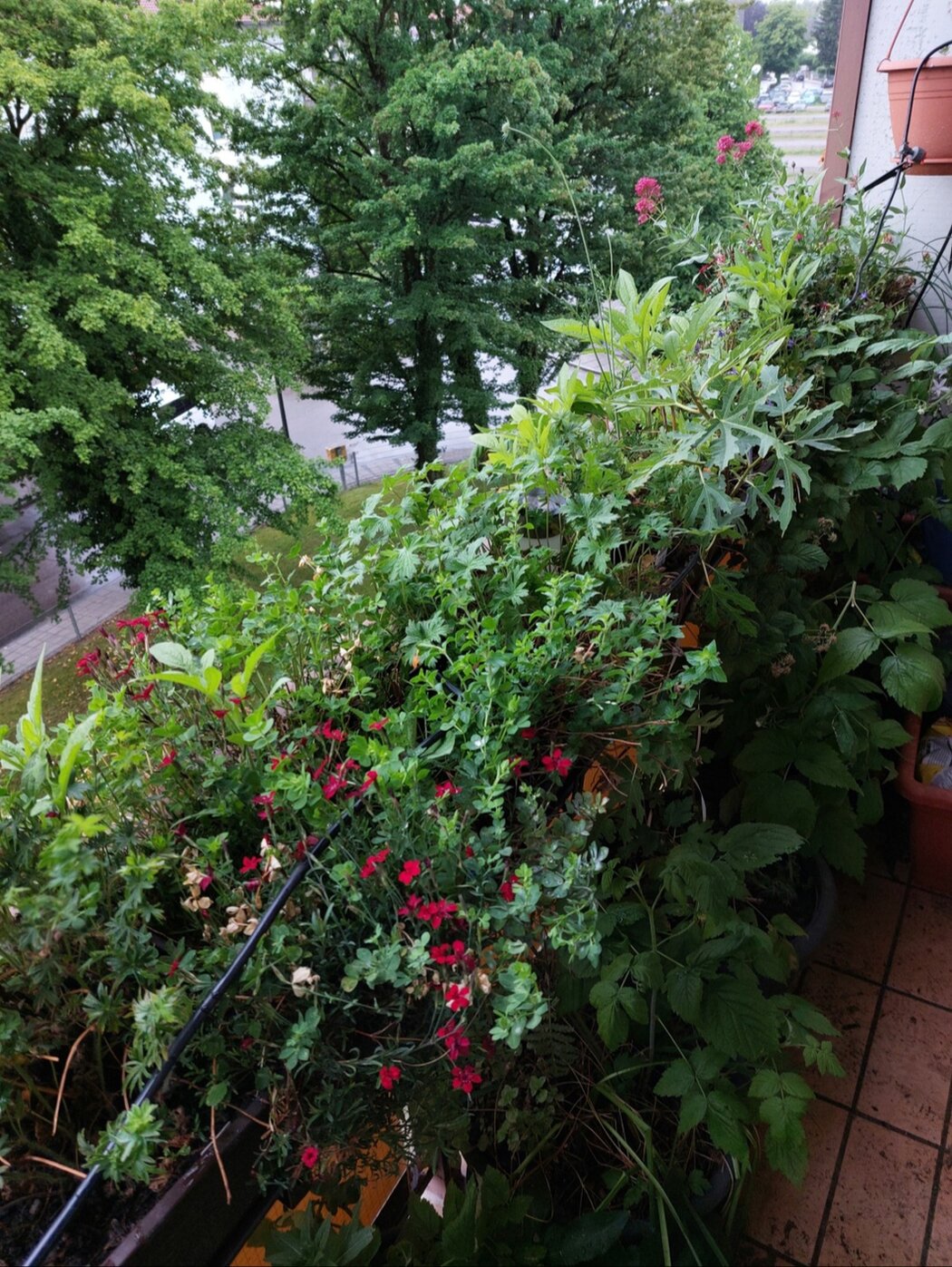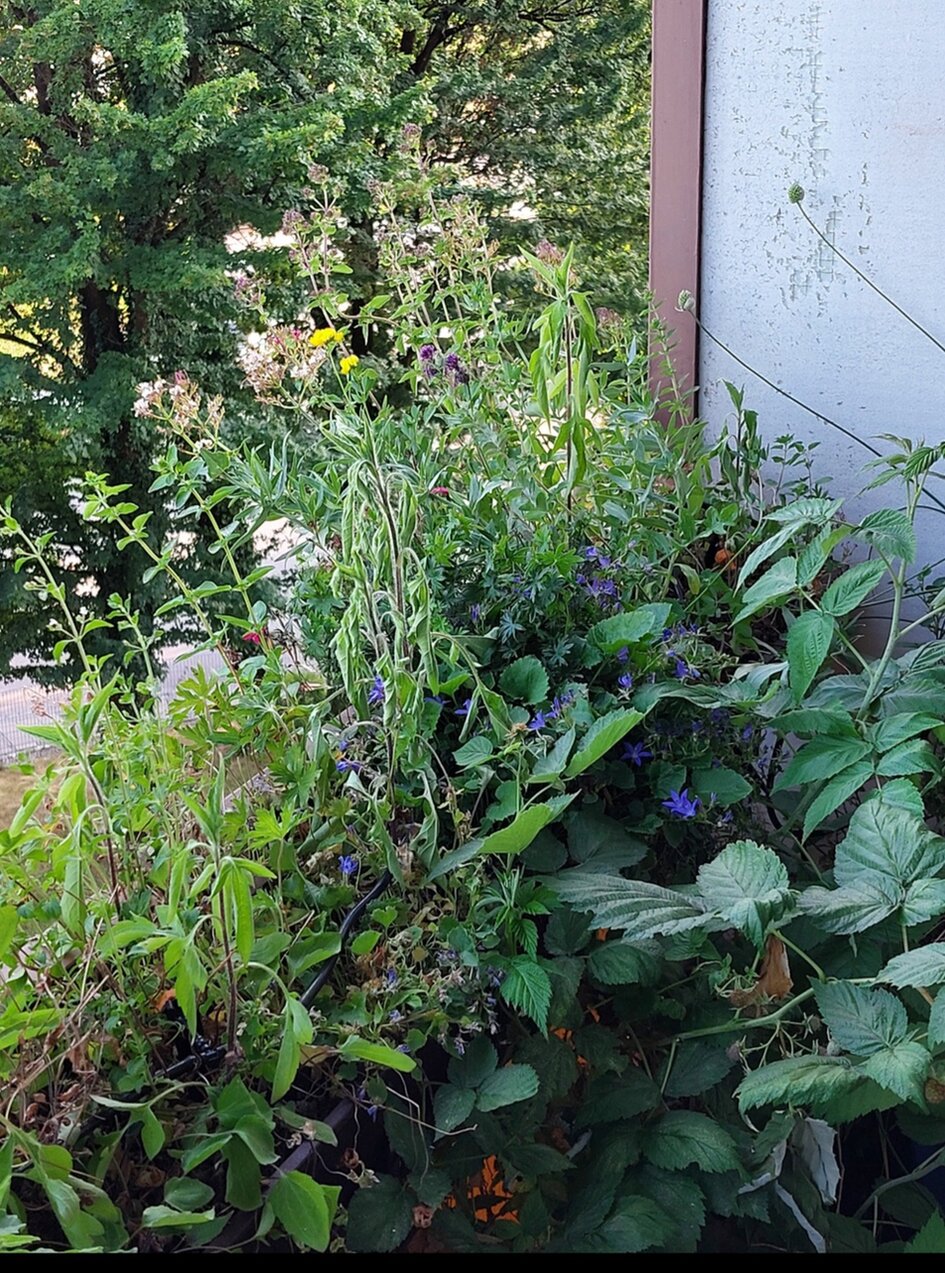 Unten stehen Kübel mit Himbeeren, eine Feige, Seifenkraut, Färberginster, Bergminze, Katzenminze, eine ungefüllte Rose, diverse Kräuter für die Küche, und drei kleine Zuchtformen des heimischen Geißblatts. Unterpflanzt sind die Himbeeren mit Veilchen und Glockenblumen. Topinambur und Knollenziehst hab ich auch.