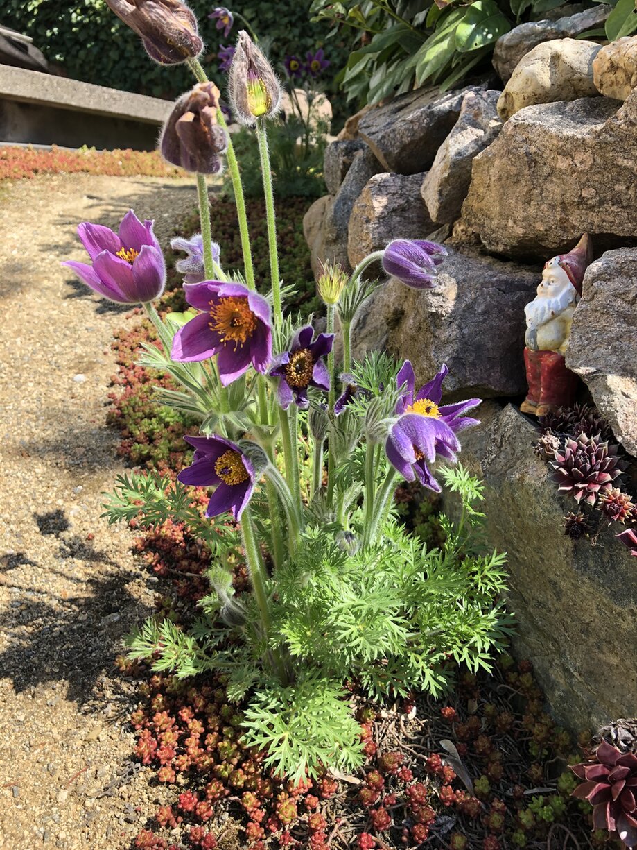 Um das Haus herum führt ein Kiesweg, der auf beiden Seiten mit Mauerpfeffer, Veilchen, Kuhschelle und anderen Pflanzen eingewachsen ist. Auch hier wurde an noch kahlen Stellen eine Fugenmischung vom Lebensinsel-Shop ausgesät.