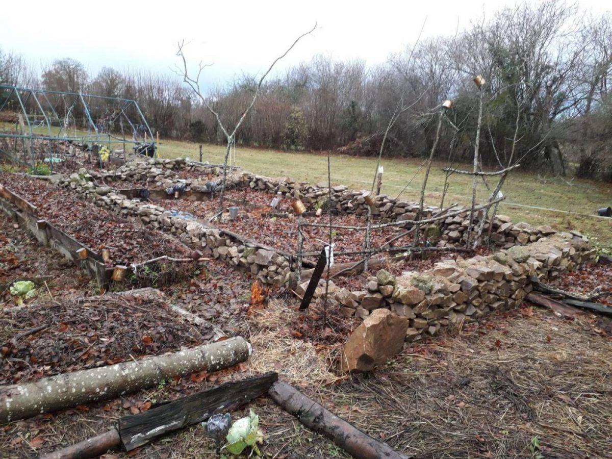 Die Ertragszone ist gemulcht, und Harvey hat selber, ohne Maschinen sein Walipini und eine Senkgrube fürs Wasser gegraben. Die Steine, die er dabei fand, hat er in Trockenmauern verarbeitet, die die Hochbeete umranden.