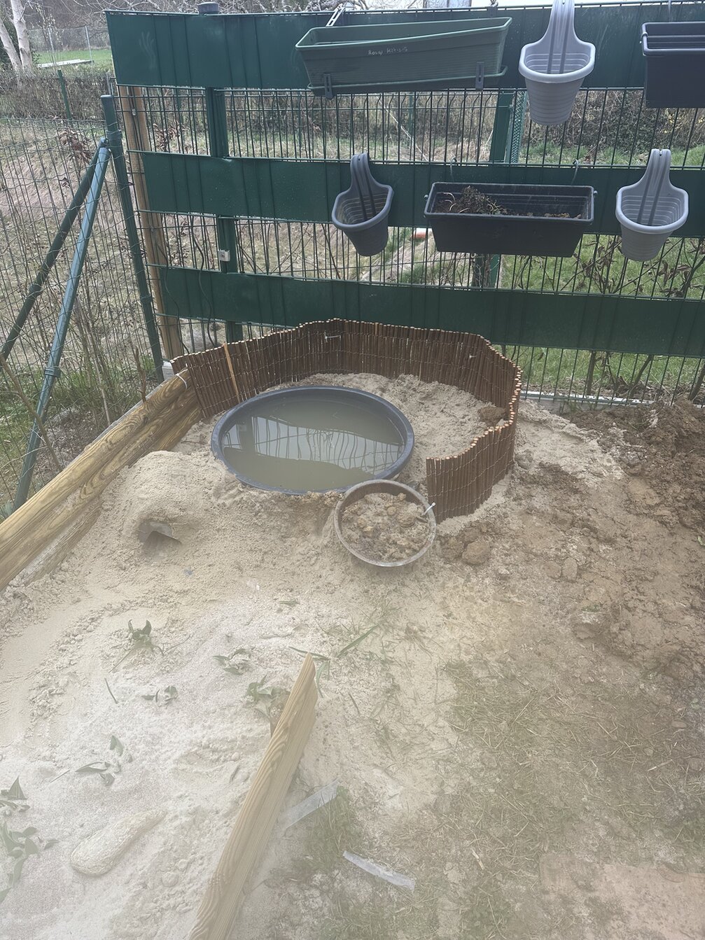 Miniteich angelegt. Leicht nach hinten geneigt. Dort soll es immer feucht sein. Ich hab vor den Rand mit Blutweigerich, Sumpfdotterblume und Wasserminze zu bepflanzen. Steine muss ich noch holen für den Rand.