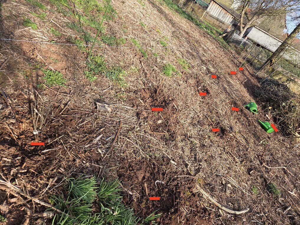 Man sieht leider nicht viel, aber sozusagen pro forma hier trotzdem Bilder. Da liegt eine weiße Schnur auf dem Boden, die mehr oder weniger die Grundstücksgrenze darstellt, sie müsste noch etwas weiter weg von den Gehölzen liegen. Da sind ca. 1,30-1,40m Abstand, was nach Niedersächsischem Nachbarschaftsrecht bedeutet, daß die 5m hoch wachsen dürfen (aber es wird keiner was sagen falls sie höher werden, weil da eine Pferdekoppel und kein Hausgrundstück angrenzt.