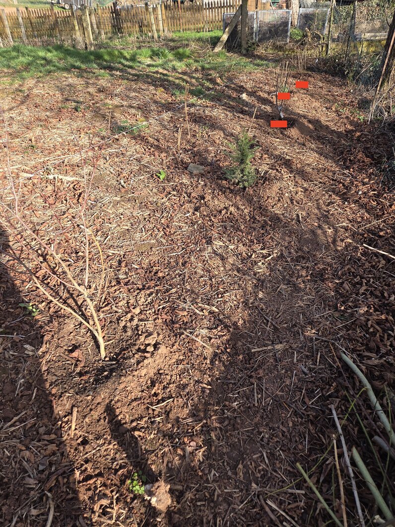 Ich habe die Pflanzen tlw. rot markiert. Die letzte markierte Pflanze im ersten Bild ist die Eibe aus dem zweiten Bild. Rundherum liegt derzeit noch Brombeerhäckselmulch (falls ihr euch fragt, was das ist).