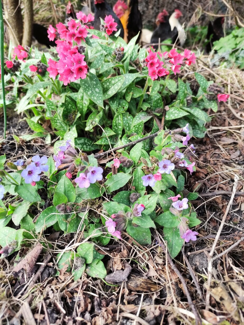 Das heimische Lungenkraut und eine Hybride blühen um die Wette.