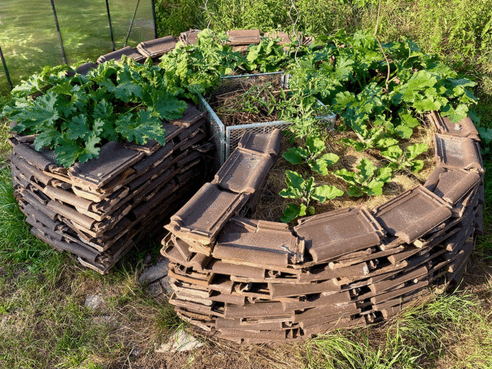 In der Ertragszone befinden sich aktuell ein aus Dachziegeln gebautes Schlüssellochbeet sowie ein weiteres Hochbeet. (2025 waren zusätzlich ein Gewächshaus und ein Vulkanbeet in Nutzung.) Die verwendete Erde stammt vollständig aus dem eigenen Garten: abgetragene Grasnarbe und nährstoffreicherer Oberboden, gemischt mit selbst hergestelltem Kompost. Erde zu kaufen war nicht nötig.