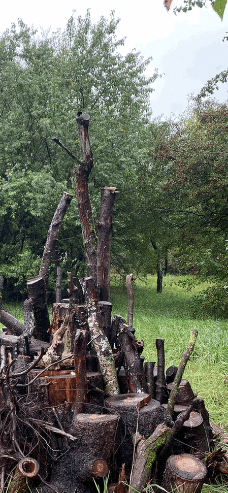 Als das Grundstück (2023) an mich weitergegeben wurde, war es in großen Teilen mit u.a. Weinreben, Brombeeren, Flieder, Götterbaum und Spätblühender Traubenkirsche überwachsen. Die gefällten Bäume und die ausgegrabenen Wurzeln wurden in Naturmodulen verbaut (oder teilweise gehäckselt und kompostiert). Es entstand beispielsweise eine Totholzhecke (Länge: 27 m, Breite: 1,2 m, Höhe 1,4 m) und einige weitere Naturmodule aus stehendem und liegendem Totholz. Auch Dachziegeln und Steine wurden zum Bau von Strukturen verwendet. Mehrere hundert Backsteine befanden sich bereits im Garten, einige Tonnen Sandstein wurden u.a. über E-Bay-Kleinanzeigen organisiert. Strukturvielfalt begünstigt Artenvielfalt, daher sehen die Naturmodule nicht nur interessant aus, sondern bieten auch Lebensraum und Nahrung.