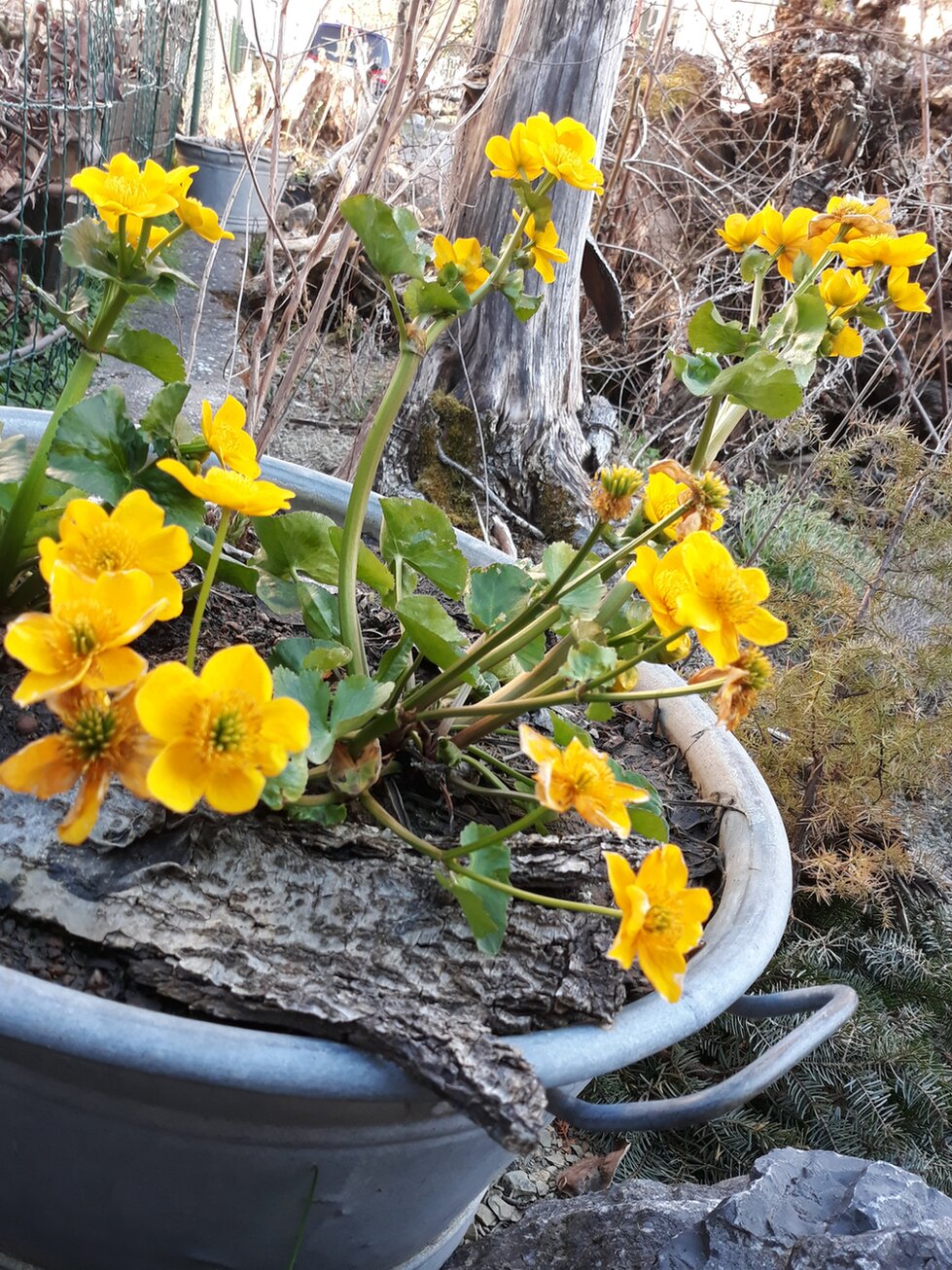 Sumpf-Dotterblume fühlt sich wohl in der Zinkwanne.