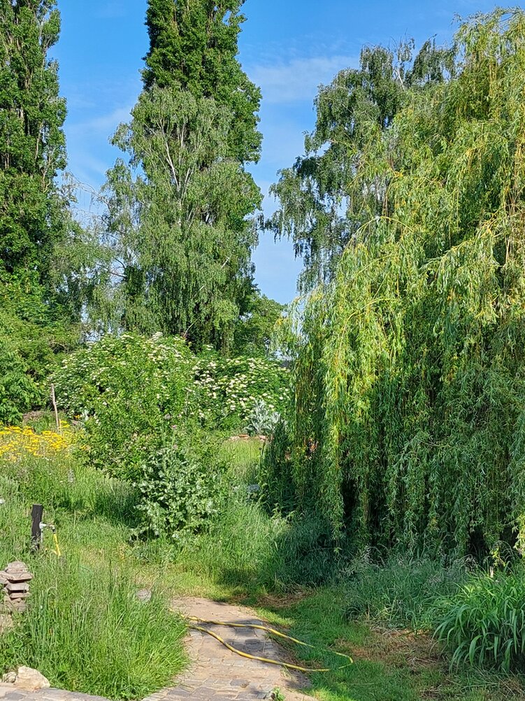 Es gab aber auch einen kleinen Teich, wo ein Frosch wohnt und, was uns sehr faszinierte, einen alten Baumbestand, eine große Trauerweide, zwei riesige Süßkirschen, eine alter Birnbaum, ein Apfelbaum, eine Zwetschge und eine krumme, noch nicht so alte und eine kleine Walnuss. Viele Holunderbüsche, ein großer Linguster, und viele junge, wilde Kirschen und Ahorne, ein Weißdorn sowie zwei Korkenzieherweiden, eine als stehendes Totholz. Ein riesiger, alter Fliederbusch wuchs auch bereits im Garten und darf bleiben, da er Teil der Pufferzone Richtung Straße ist und wir den Duft und die dunkellila Farbe der Blüten mögen. An der Straße vor dem Garten stehen zwei Ahorne.