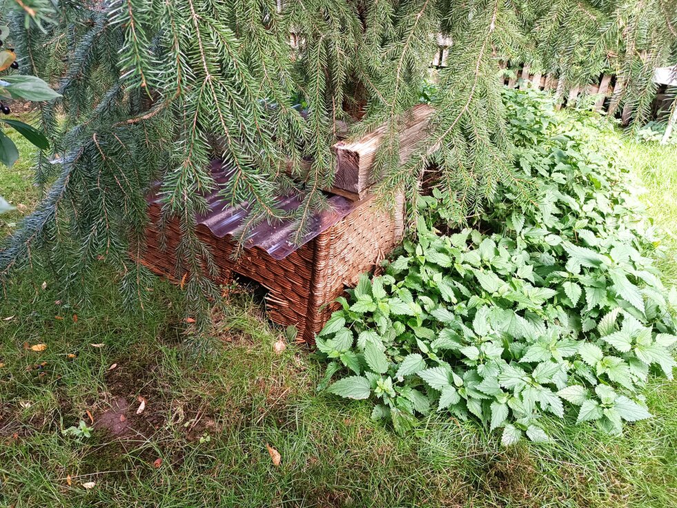 Im Sommer hatte ich noch solch einen Weidekorb übrig. Ich habe daraus einen Igel-Unterschlupf gebaut. Ein Dach ist auch darauf. Vor kurzem ist mir aufgefallen das die Spinnweben im Eingang weg sind, also kann ich schlussfolgern das jemand