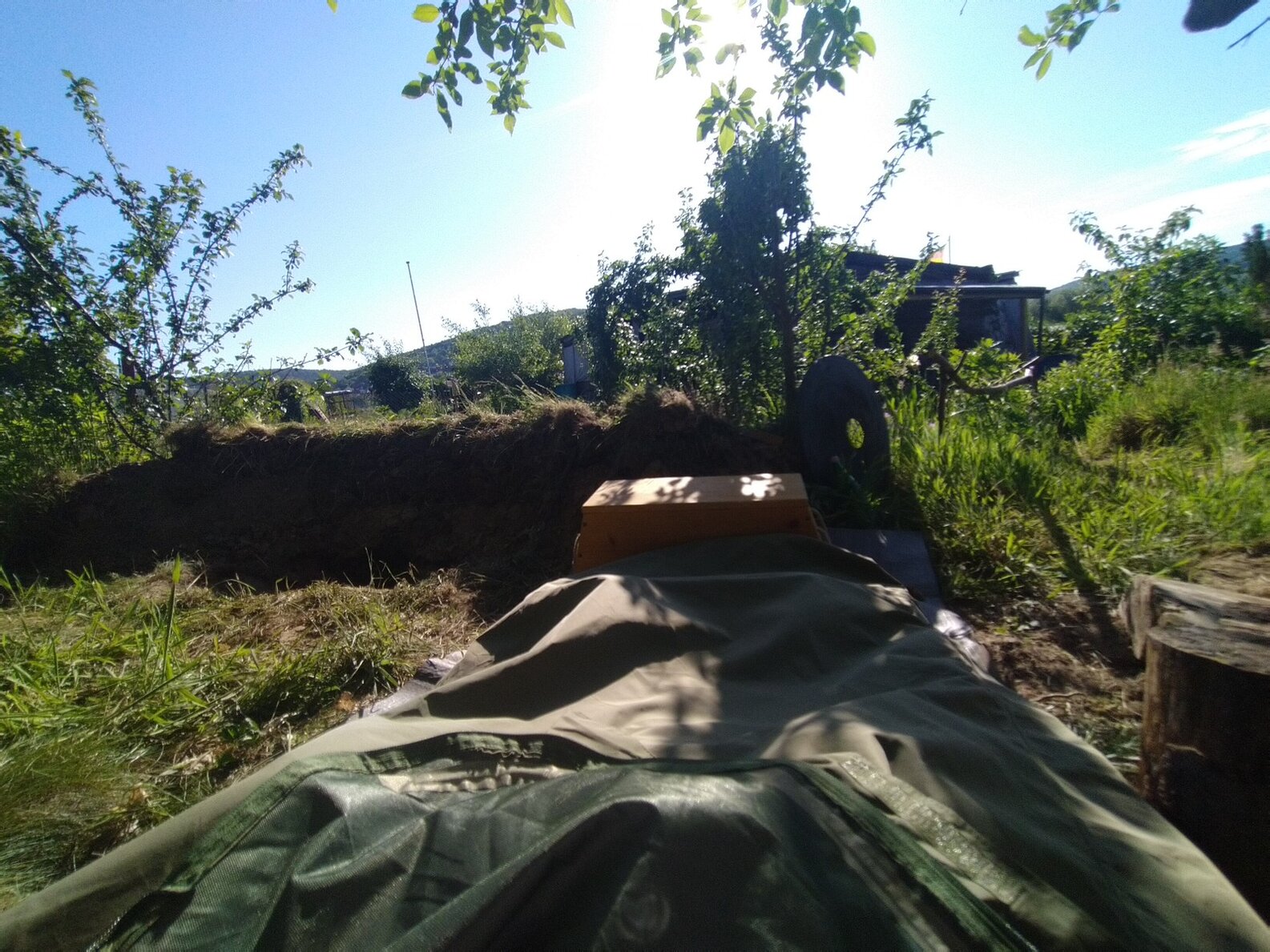 Ich habe öfters im Biwaksack unter dem Pflaumenbaum geschlafen, wo mich die Meisen früh morgens begrüßten und auch die eine und andere Ameise von meiner Schlafpelle pickten. Eine kleine Feuergrube vervollständigt das Quartier.