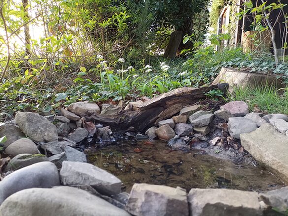 An der Pfütze habe ich unter der Folie ein bisschen Erde weggenommen und den Folienrand anders verlegt, sodass sie jetzt etwas mehr Volumen hat. Der Bärlauch daneben hat sich seit der Pflanzung 2020 schon ein bisschen vermehrt.