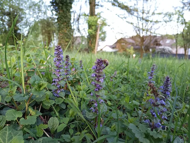 In der Wiese drunter blüht der kriechende Günsel und die Frühlings-Pelzbiene freut sich drüber.