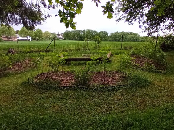 Schnittblumenbeete um die Feuerstelle. Hinten am Zaun zwischen den Pyramiden 12x1m Wildbienen-Saum.