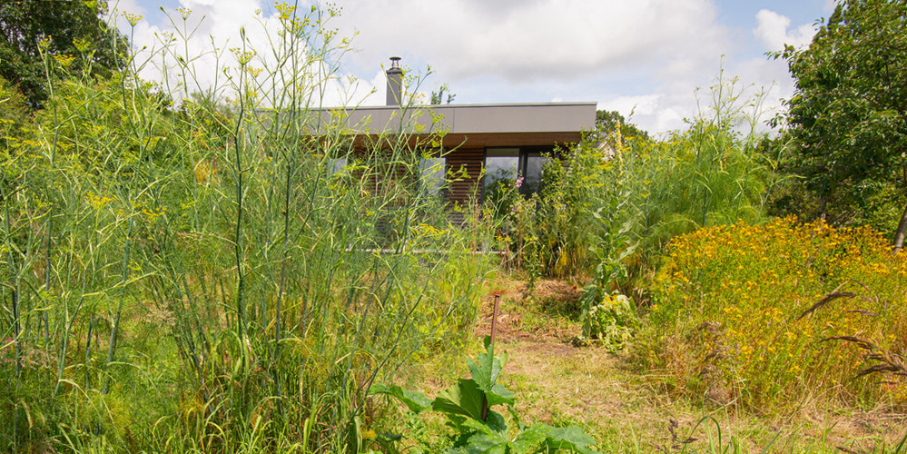 In der Pufferzone ist an 3/4 des Gartens mit an einer Längsseite mit heimischen Wildsträuchern aus Schlehe, Holunder, Felsenbirne, Hasel, Kornelkirsche.