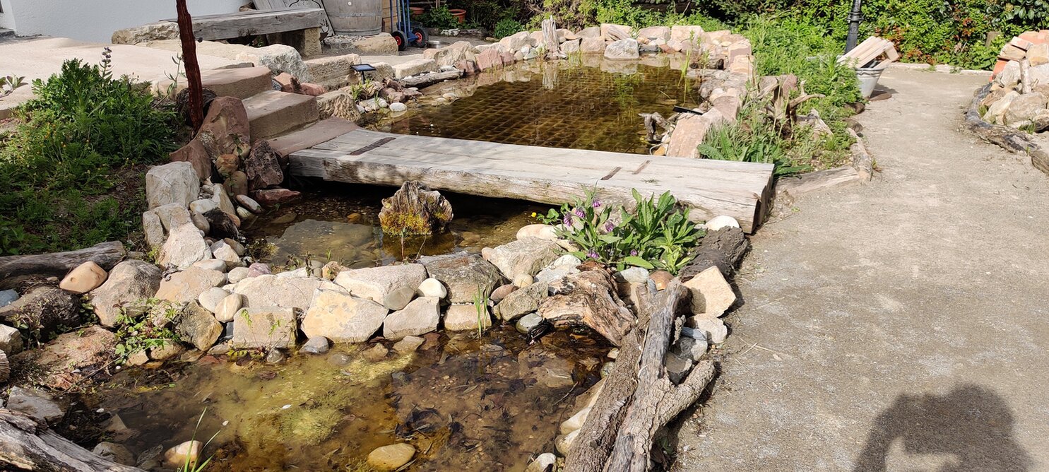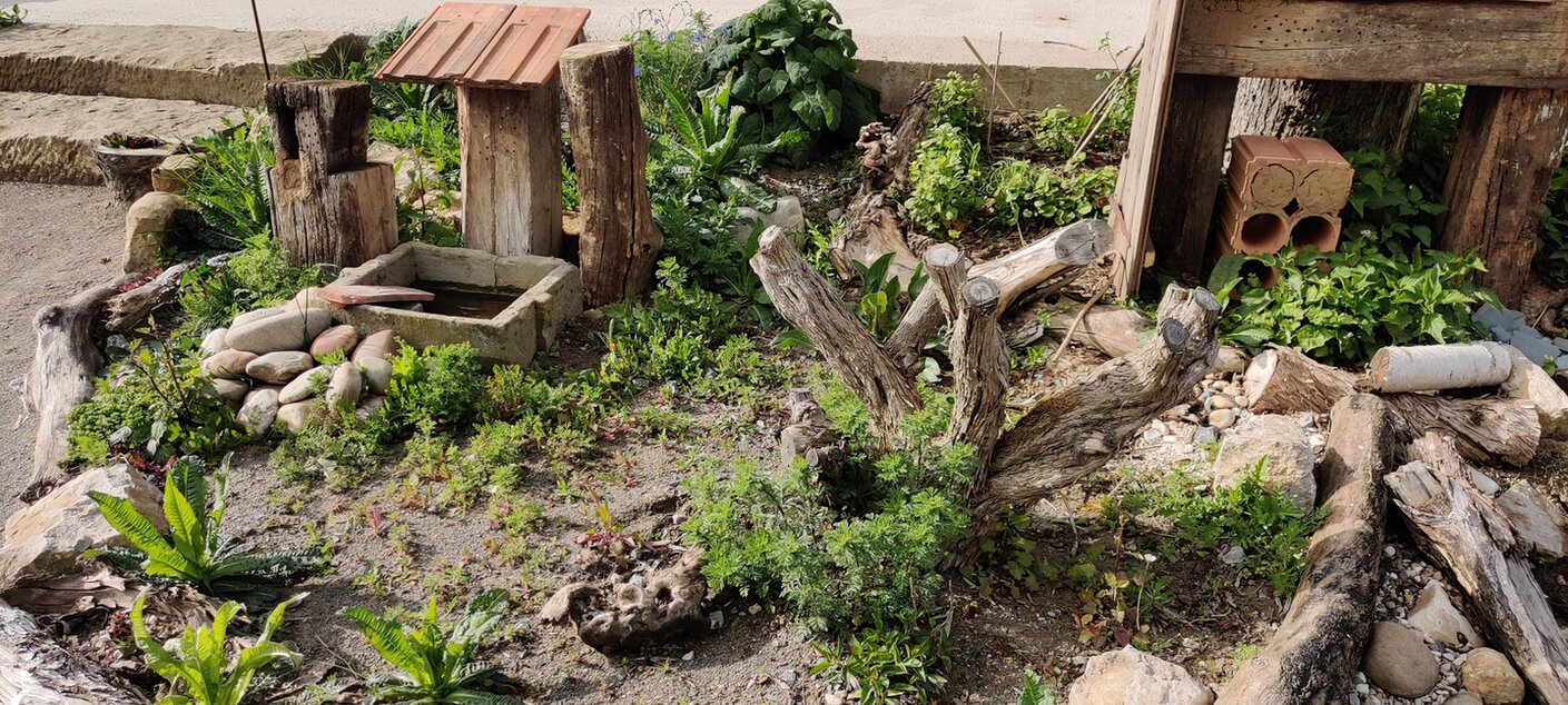 Naturmodule: Käferkeller, Eidechsenburg mit Sand, Steinmauer, Igel-Haus, Nisthilfe, Teich der mit Regenwasser gespeist wird und Überlauf in Sumpfbereich. Wurde mit heimischen Wasserpflanzen versehen.