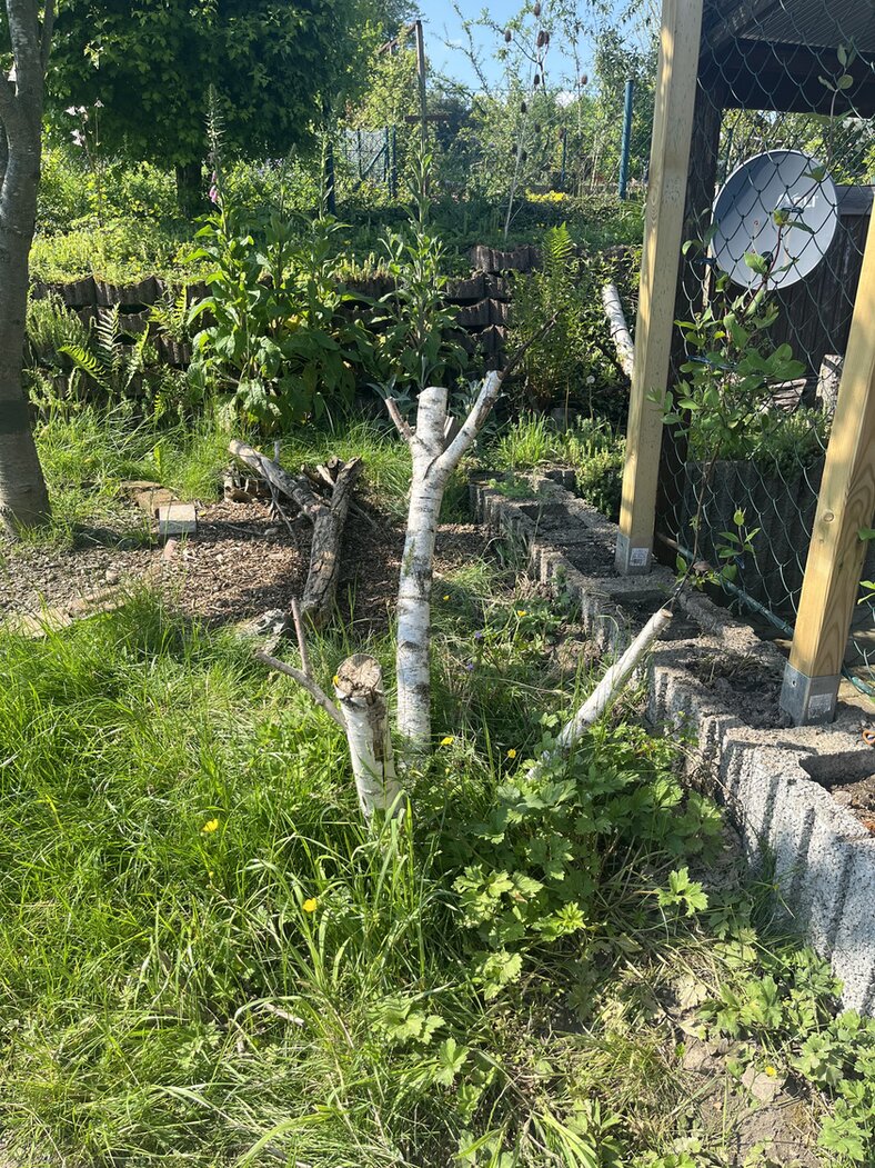 An die größere der beiden Wiesen grenzt die Benjeshecke, die eigentlich auf der anderen Seite eine Beetbegrenzung darstellen sollte. Dadurch, dass der Boden hinter der Hecke jedoch massiv verdichtet ist und bereits nach mäßigen Regenfällen dort das Wasser steht, haben dort weder Gemüse noch Obststräucher überlebt. Also haben wir kurzerhand beschlossen, aus der Not eine Tugend zu machen und ein weiteres Sumpfbeet mit kleinem Tümpel anzulegen. Der Faulbaum ist bereits gepflanzt und fühlt sich pudelwohl.