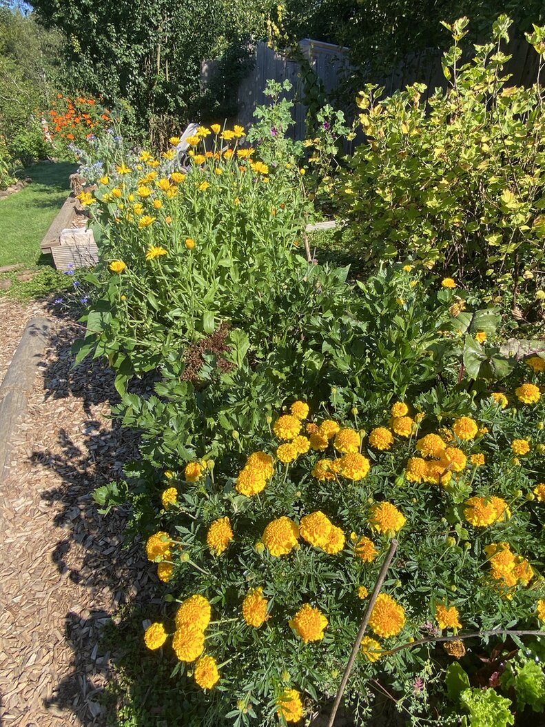 Ringelblumen , Tagetes und Kartoffelstücke an Stäbchen. Glaube wir arrangieren uns mit den Drahtbiestern.