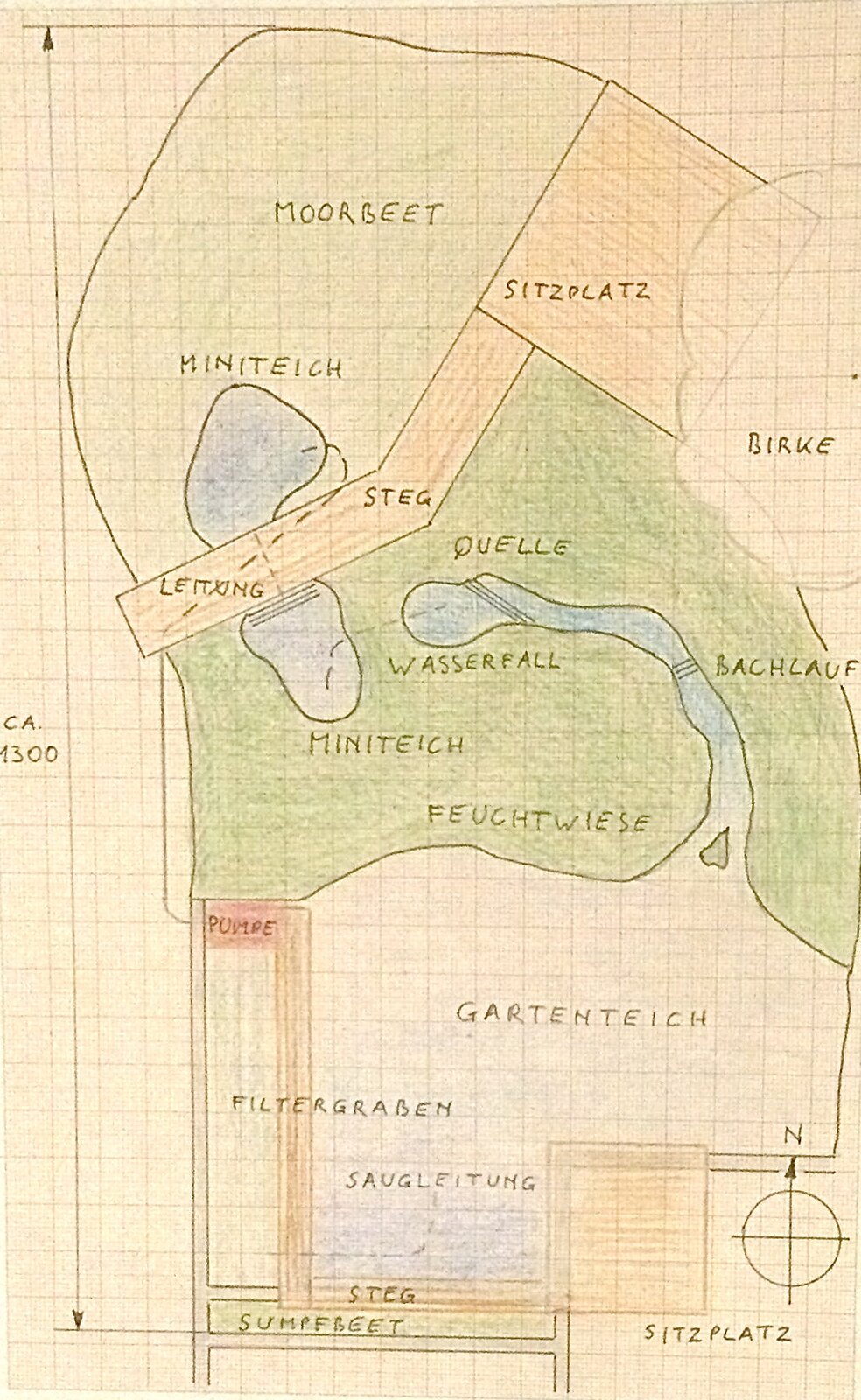 Ausserdem möchte ich gerne eine etwas grössere Sumpfzone (SZ) haben. Desswegen glaube ich eine bessere Lösung gefunden zu haben. Die SZ trenne ich physisch von der Feuchtwiese (FW) damit Platz entsteht für eine Verbindung mit einer kleinen Brücke direkt zum Sitzplatz. Die SZ verschiebt sich dann Richtung Norden und kann den Sitzplatz im Nordwesten umschliessen. Der Miniteich in der SZ rutscht mit einer Spitze unter die Brücke. Der Miniteich der Feuchtwiese rutscht von der Südseite auch an die Brücke heran. Ein kleiner Wasserfall überbrückt den Höhenunterschied. Der Wasserfall ergiesst sich also direkt in den unteren Miniteich.