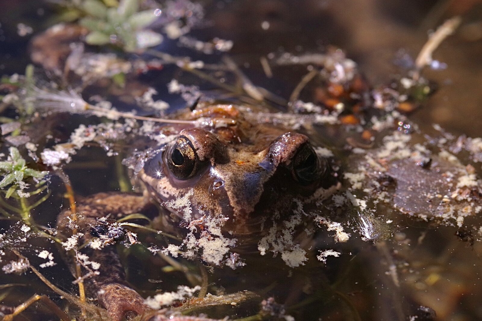 Das Leben im und am Gartenteich entwickelt sich schnell und magisch. Der Frosch kam angeschwommen, als ich mich über die Kante beugte und blieb dort obwohl ich mit der Kamera rumhandterte.