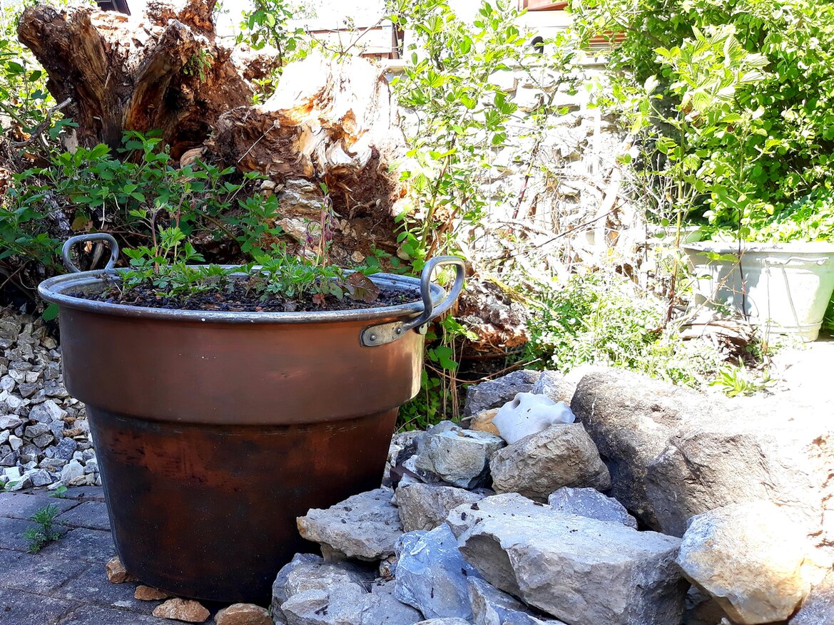 Die gepflasterte Hoffläche wird Stück für Stück grüner, bunter, interessanter. Das Topfgärtnern macht mir richtig Spaß. Hier darf es auch öfter mal eine Sorte oder ein Neophyt sein, etliches wurde aus dem Friedhofscontainer gerettet. Wir sitzen jetzt dort viel gemütlicher am Tisch zwischen den ganzen Kübeln, Steinen und Wurzeln.