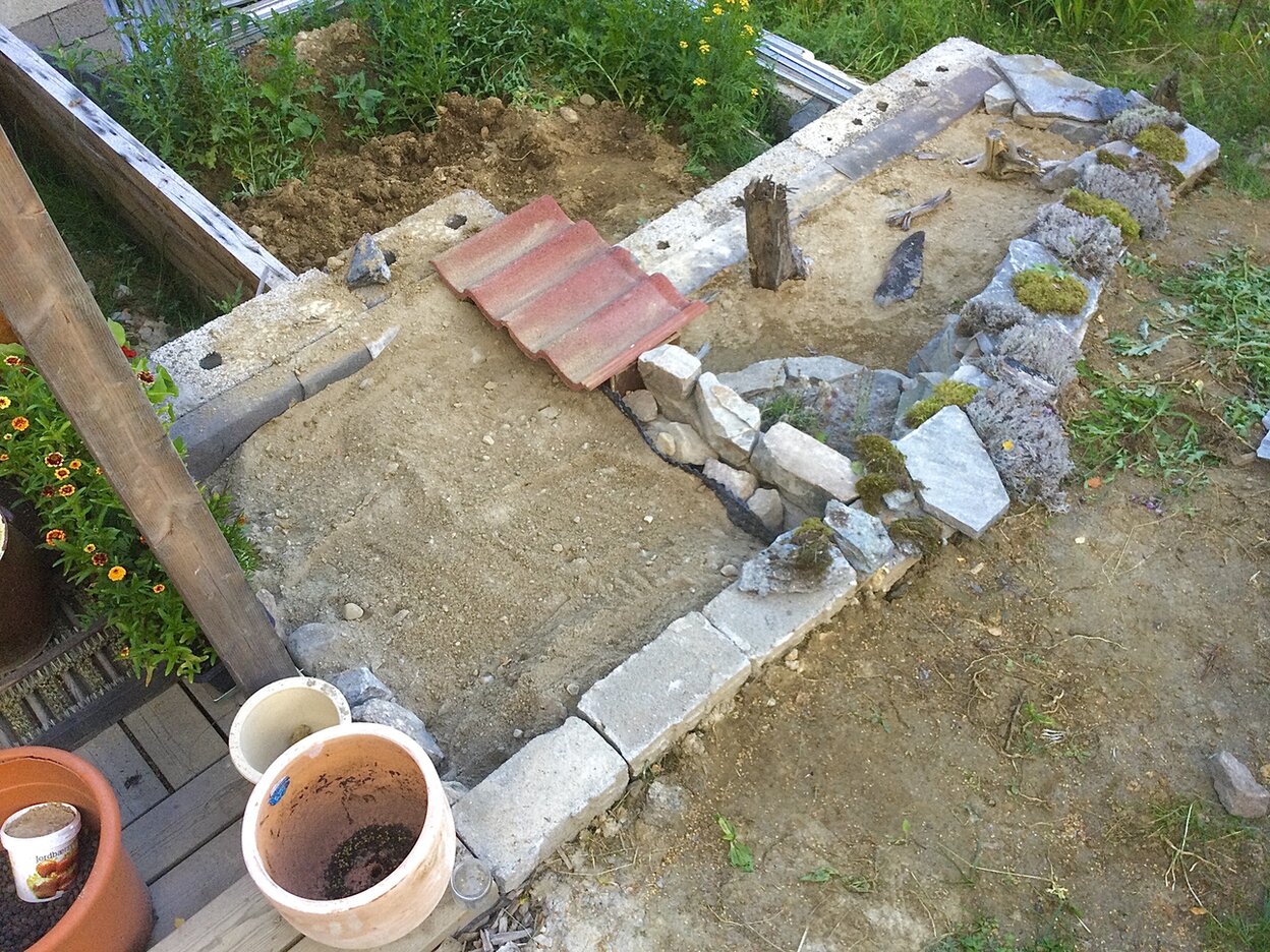 Die Mauer neben dem Sandarium ist übrigens das Fundament für das geplante Gewächshaus. Die ist isoliert mit Resten die bei den Grundmauerarbeiten übrich geblieben sind. Geschützt habe ich die mit alten Teerpappe.