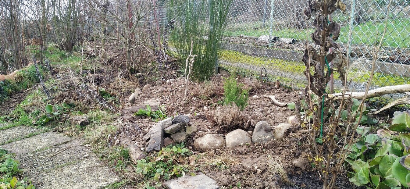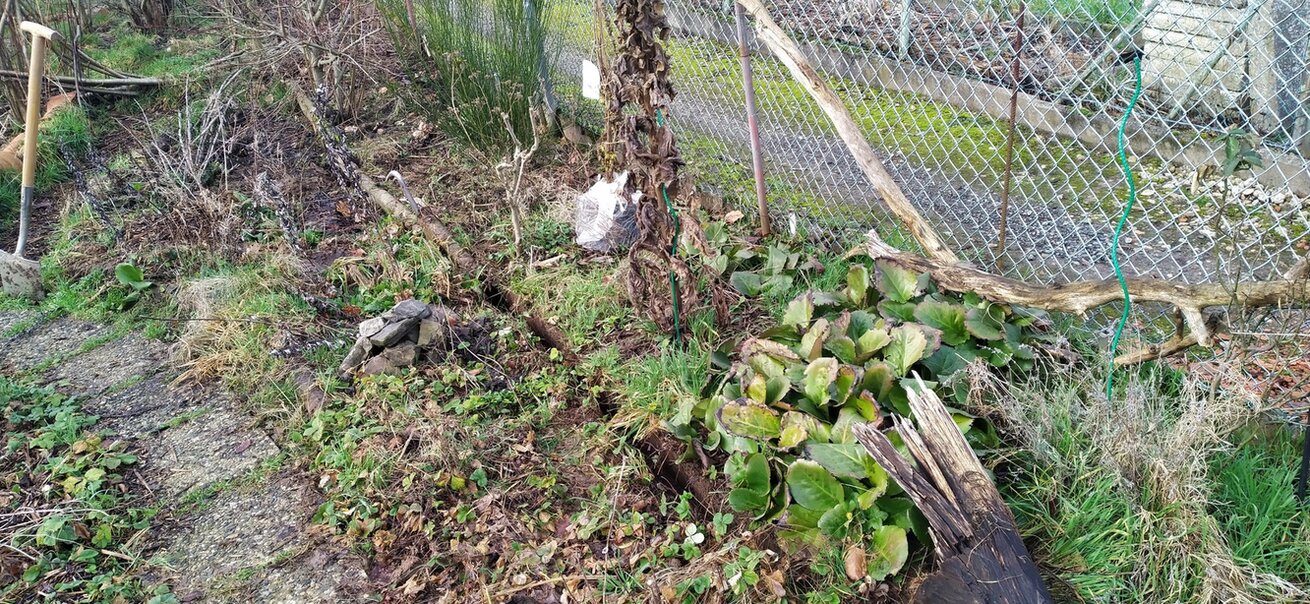 Letzte Woche habe ich mir Weißdorn, Schlehe, einen Wacholder und eine Zaubernuss für das Kriterium "Pufferzone" gekauft weil ich die sehr liebe. :paket Am Sonntag, beim Probestellen kam mir die geniale Idee, die schon schräg stehenden Zementdinger rauszunehmen. Dadurch sieht der Bereich gleich viel größer aus und die hässliche Trennung ist beseitigt.