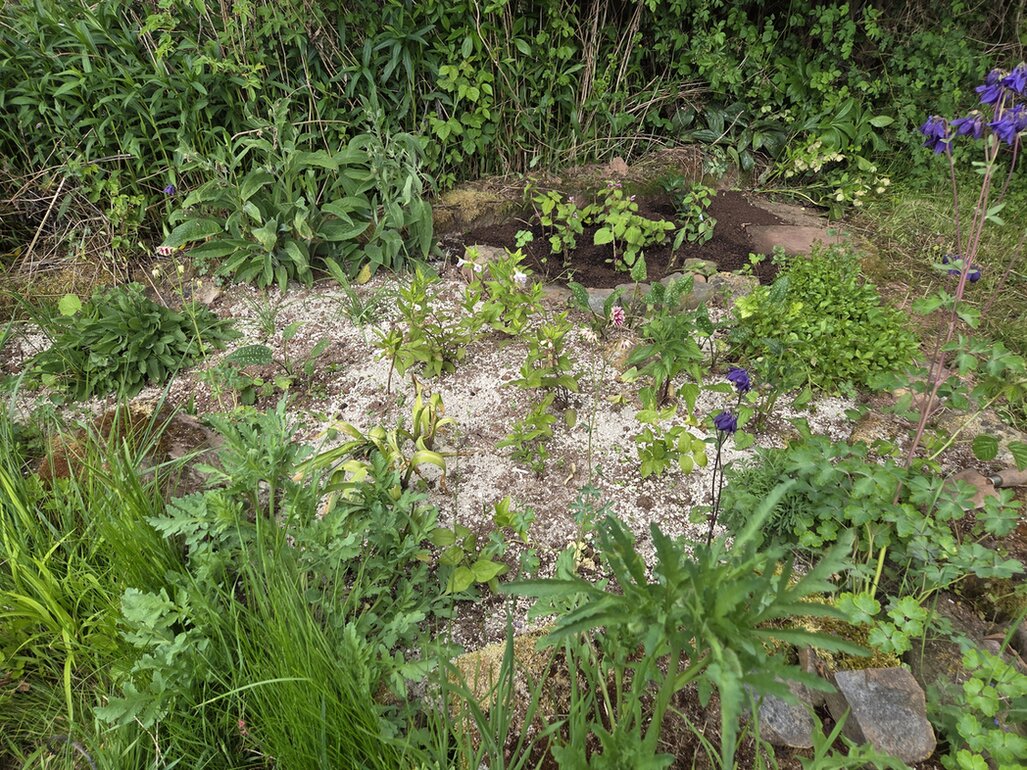 Mittelfristig bekommen der vordere und der hintere Teil noch eine Mulchdecke aus Flusskieseln oder sowas, dann sieht das ganze Beet auch etwas weniger seltsam aus