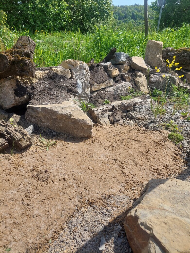Heute konnte ich endlich die letzte, noch leere Fläche am Wanderparkplatz unserer Natur nah dran Fläche fertig stellen. Nachdem es weder Marc, Marcel und den Bauhofmitarbeitern möglich war groben, ungewaschenen Sand vom Steinbruch, 3 km weiter, zu bringen hab ich heute den Sandkasten meiner Enkel geleert, den Sand mit Lehmpulver aus meinem Bestand 70:30 gemischt und so eine Art Sandarium angelegt. Mal sehen ob die Fläche, nach dem trocknen stabil genug ist um bodenbrütenden Wildbienen Lebensraum zu geben.