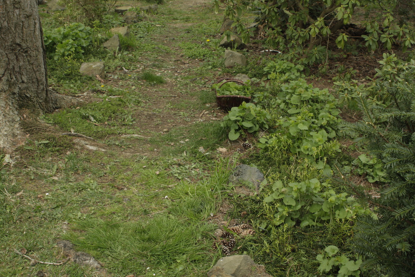 Hinter der angebundenen Birke geht es die Heidelbeerallee runter. Nach dem Abzweig folgt eine Reihe Beerensträucher, unter die ich die Melissen hinversetzte. An ihrem alten Standort hatten sie immer Sonnenbrand. Das hat ein Bisschen länger gedauert, weil ich die Horste Veilchen und die Bodendeckerstachelbeeren erhalten wollte.