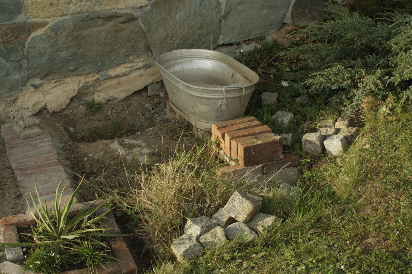 Endlich bin ich das Sandarium angegangen. Das hatte ich letztes Jahr schon begonnen, zweifelte dann an der Platzwahl. Über das Jahr fanden sich in dem bereits aufgeschütteten Lehm-Sand-Gemisch einige Löcher. Die Zeichen waren eindeutig.