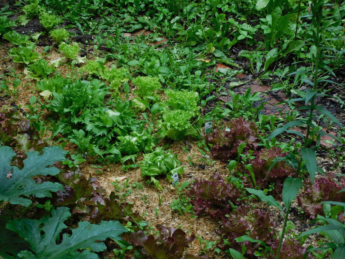 Im Gemüsebeet wächst und gedeiht der Salat, der spontan mit frischen Fichtenhobelspänen gemulcht wurde. Die Späne haben sich als gute Schneckenabwehr erwiesen.
