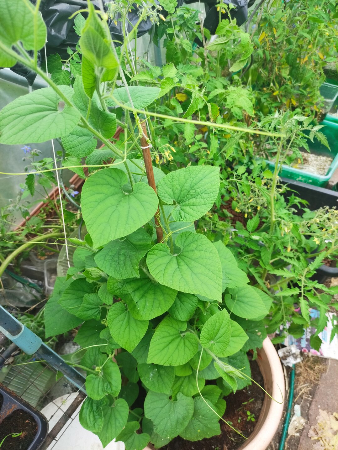 Die Knollengurke (Thladiantha dubia ) entwickelt sich gut. Die Pflanze musste ins Gewächshaus umziehen, im Freiland war sie zu sehr dem Schneckenfraß ausgesetzt.