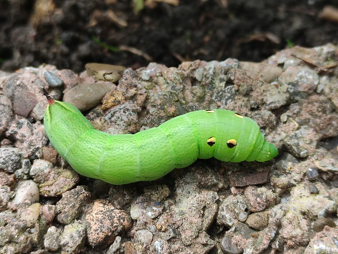 Ich habe eine Raupe des Mittleren Weinschwärmer (Deilephila elpenor) im Garten gefunden.