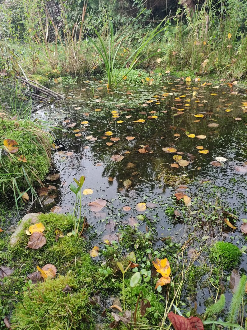 Unser Teich ist seit Samstag eingenetzt, leider, aber es muß sein. Das Netz liegt jetzt schon voll mit Blättern der umstehenden Bäume. Vorher habe ich an drei Tagen stundenlang Wasserlinsen und Laub rausgefischt und aufkeimende Salweiden vom Uferrand entfernt. Natürlich haben wir auch wieder einen Durchschlupf für Molche und Frösche gelassen. Sobald der Laubfall vorüber ist, kommt das Netz wieder weg, damit alle Tiere ohne Probleme trinken und baden können.