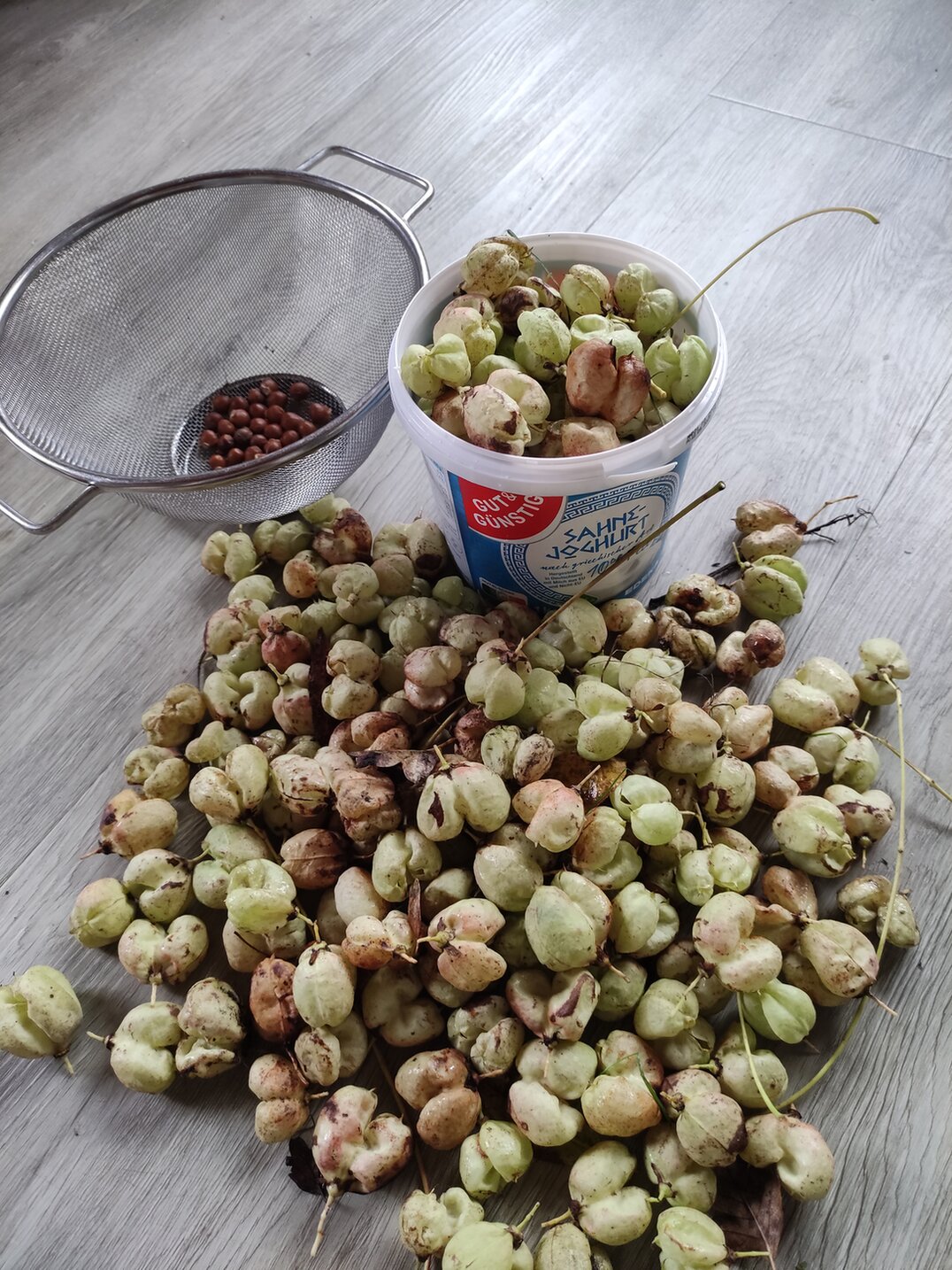 Diesjährige Ernte der Pimpernuss, ein Teil hängt noch am Strauch.