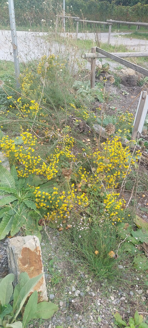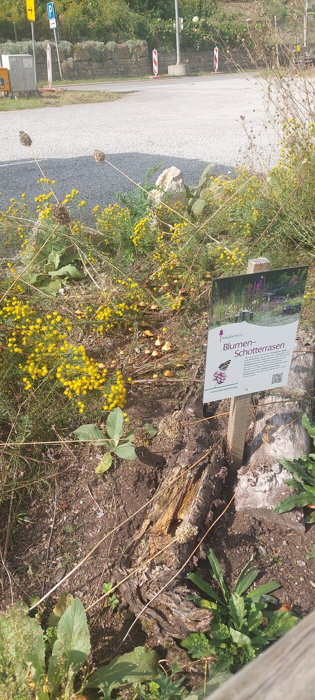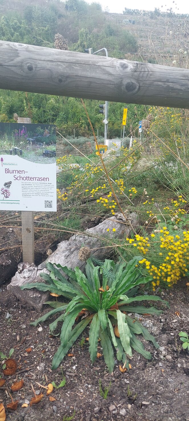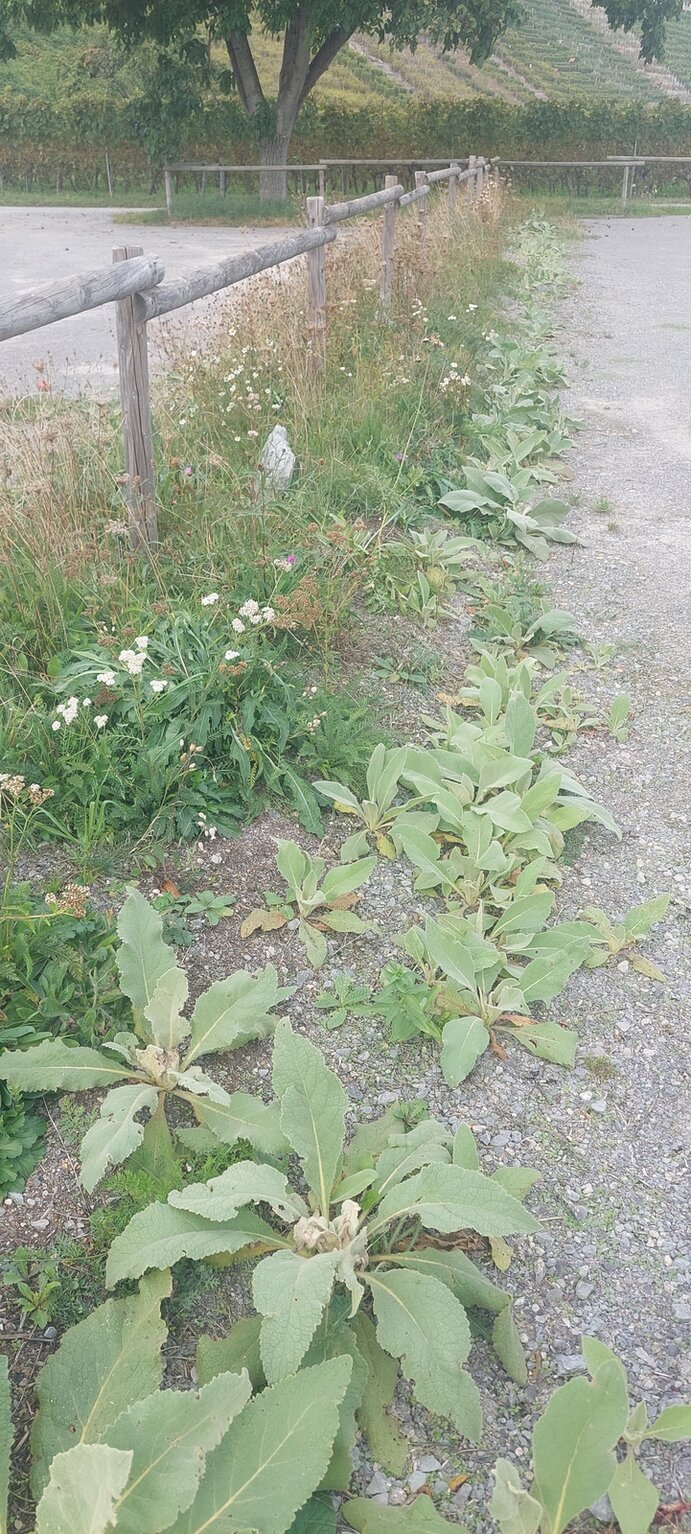 Unsere Natur nah dran Flächen haben sich im ersten Jahr sehr schön und artenreich entwickelt. Wo vorher nichts war wächst jetzt alles üppig im Schotter. Wunderbar blüht derzeit die Goldhaaraster. Zwischen den Parkreihen war immer die Frage wie wir die Reihe eingrenzen können, damit die Auto's nicht so weit vor fahren können das sie in der Fläche stehen. Wie wunderbar ist doch die Natur zusammen mit dem Regen, sie hat wie von Geisterhand die Samen der Königskerzen soweit nach außen gespült. Jetzt ist die Parkreihe wunderbar geradlinig von Königskerzenrosetten eingegrenzt. Schön das es die Blühfläche nun um 50 cm erweitert und die Parkenden sogar genügend Abstand lassen um die Blumen nicht zu überfahren. Der Hang zum Neckarufer hat sich ebenfalls prächtig entwickelt und wurde inzwischen von 3 verschiedenen Arten Eidechsen besiedelt. Jetzt ist es spannend wie die Flächen im 2. Jahr, mit den 2jährigen Arten blühen werden.