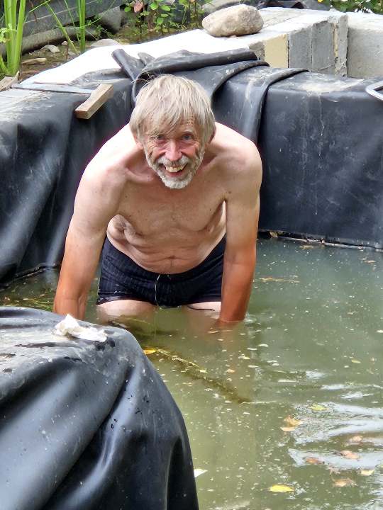 Danach geht es 3,5 mtr runter zum Teich und genau in die Richtung vom Küchenfenster, bzw. Fenster im Bad. Von dort aus hat man den Blick auf die kleine Wasserfälle zwischen den Becken. Der Höhenunterschied zwischen Auslauf von der "Quelle" und Oberkante von der Kapillarsperre ist etwa 22 cm.