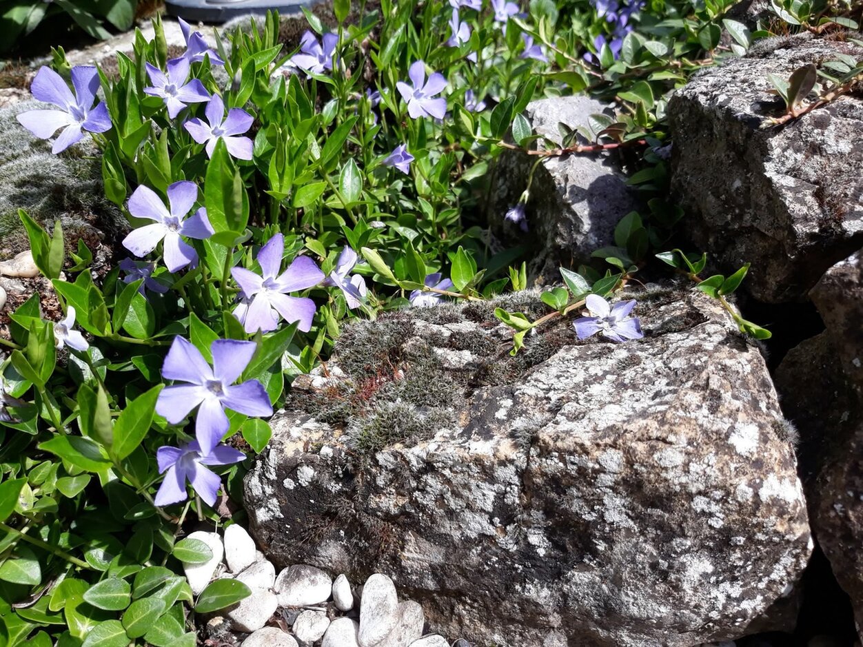 Frühjahr: Das Kleine Immergrün erklimmt die Eidechsenburg.