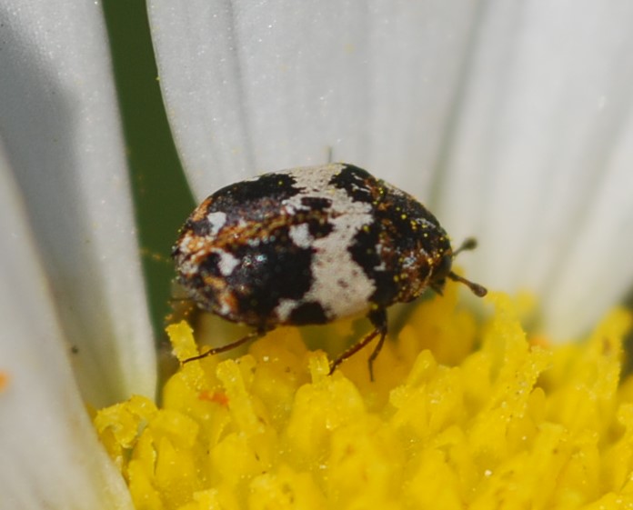 Heute konnte ich in den Blütenständen der Wiesen-Magarete mehrere Bibernellen-Blütenkäfer (Anthrenus pimpinellae) beobachten.