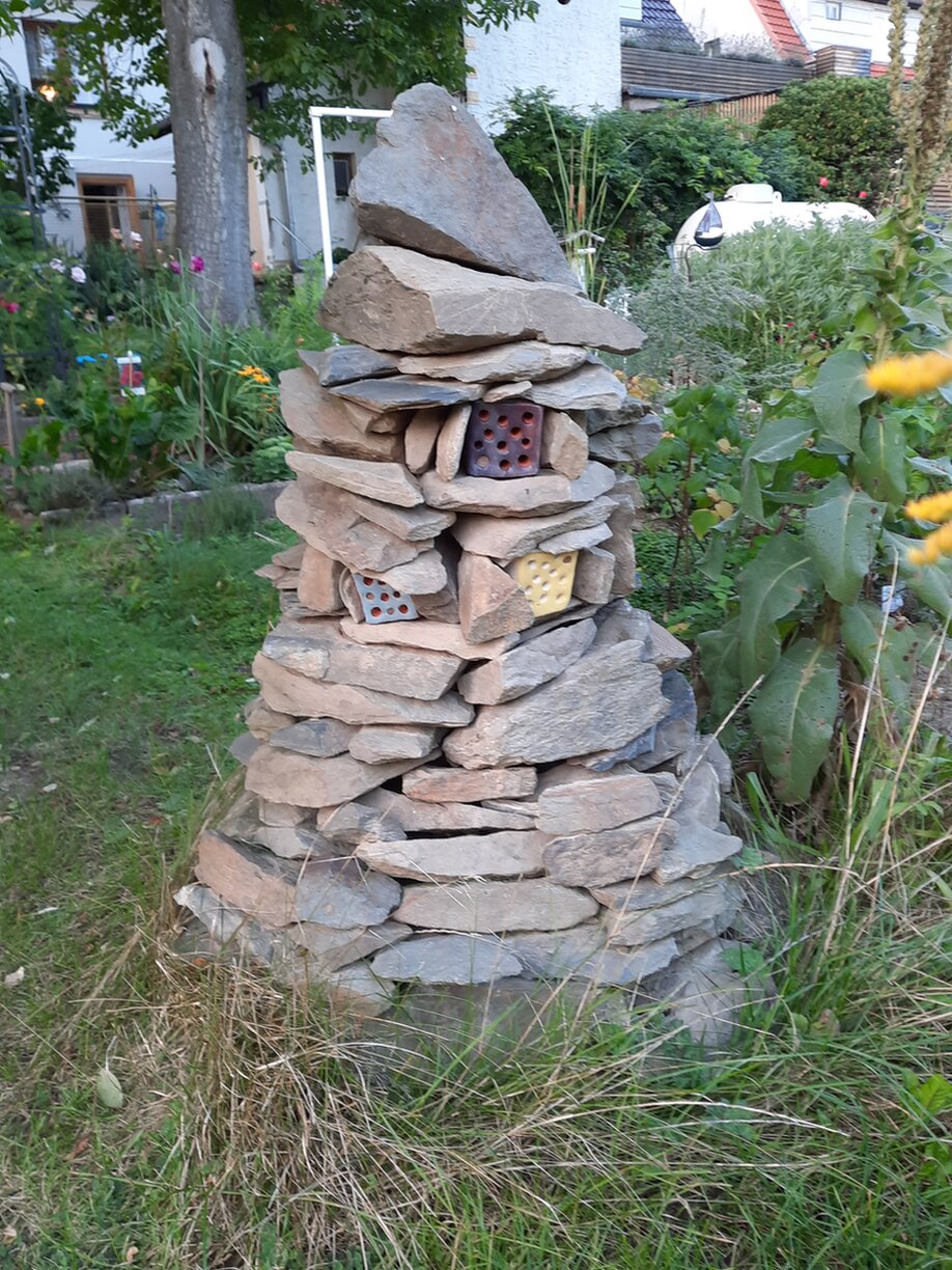 Auch die Hortus-Pyramide war schon ziemlich früh da. Freunde brachten uns Schiefersteine vom Ausschachten und bauten gleich damit die Pyramide mit den ersten Wildbienensteinen. Die Pyramide bekam bei uns den Namen Zauberhut, weil sie uns so an den "Sprechenden Hut" erinnerte.