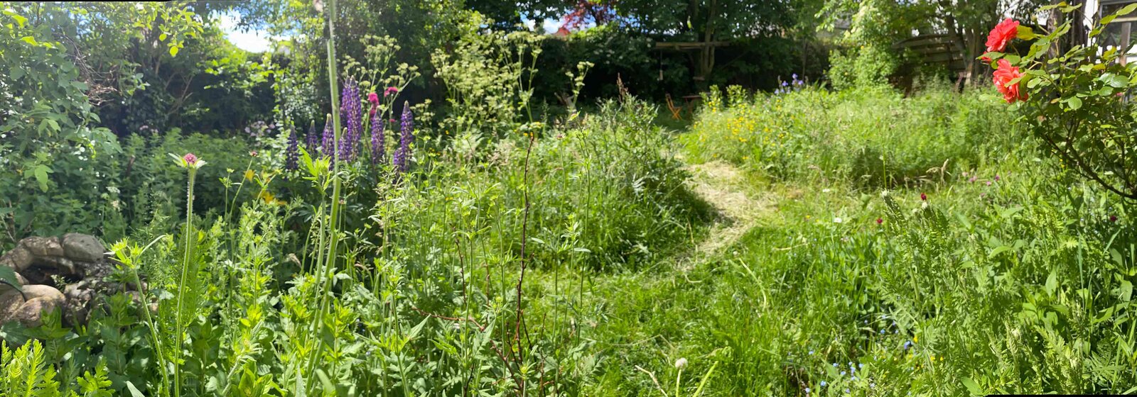 Im sonnigsten Teil habe ich als Hotspot eine Stückchen Wildwiese »angelegt« (d.h. die Wiese nur noch einmal jährlich mit Hand geschnitten), geschaut was von selber wachsen möchte und gezielt Pollen- und Nektarpflanzen angesiedelt. Schwerpunkt war und ist: Pollen- und Nektarpflanzen im zeitigen Frühjahr zur Verfügung zu stellen, das »Blühloch« ab Juli zu füllen und auch den Herbst abzudecken. Von Markus inspiriert mähe ich mit Hand nur noch schmale Wege wie z.B. von Gartentor zu Terrasse.