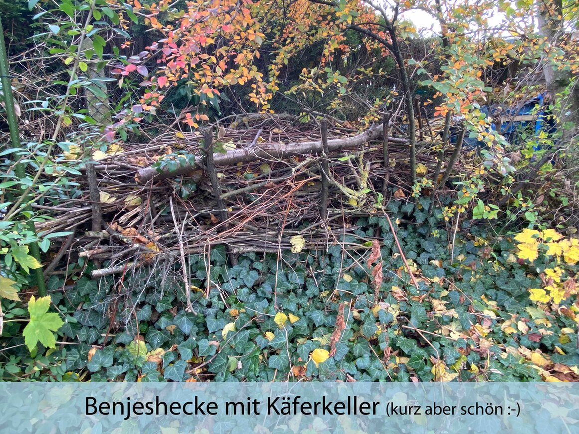 Die Pufferzone wurde vergrößert (damit die unsäglichen Thujahecken zumindest optisch verschwinden). Holunder, Liguster, Hundsrosen, Eiben, Berberitze etc., die sich von selber einfanden, durften – da wo es »passte« – an Ort und Stelle wachsen. Kirschlorbeer, Flieder, Forsythie mussten gehen, heimische Büsche wie z.B. ein Feuerdorn dafür zu uns kommen. Ein Steinhaufen, mehrere Insektennisthilfe hielten Einzug.