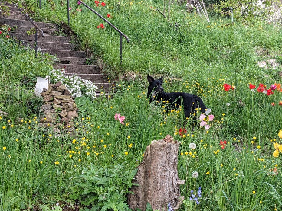 Dies ist die Überarbeitung meines Vorstellungstextes von 2019, und ich merke, wie viel sich geändert hat! Das Baumhaus in der Wildkirsche mit Seilbahn zum Hausbalkon wird längst nicht mehr benutzt. Der Sandkasten ist verschwunden. Der Katzen werden immer mehr, sie werden langsam zu einem echten Problem (wenn man Eidechse oder Vogel ist jedenfalls). Die Hecke der Pufferzone ist zu eng stehenden Einzelbäumen herangewachsen, weil ich es im rechten Moment einfach nicht geschafft habe, sie zu "legen", was ich ursprünglich vor hatte. Bäume wurden gefällt, Pflanzen haben sich angesiedelt oder wurden gepflanzt, andere sind verschwunden. Dicke Totholzstämme nähern sich dem Staubstadium. Andererseits scheinen vom Vorbesitzer übernommene Relikte einfach untötbar, und noch immer schlagen irgendwo Forsythien aus totgeglaubten Wurzelstöcken aus.