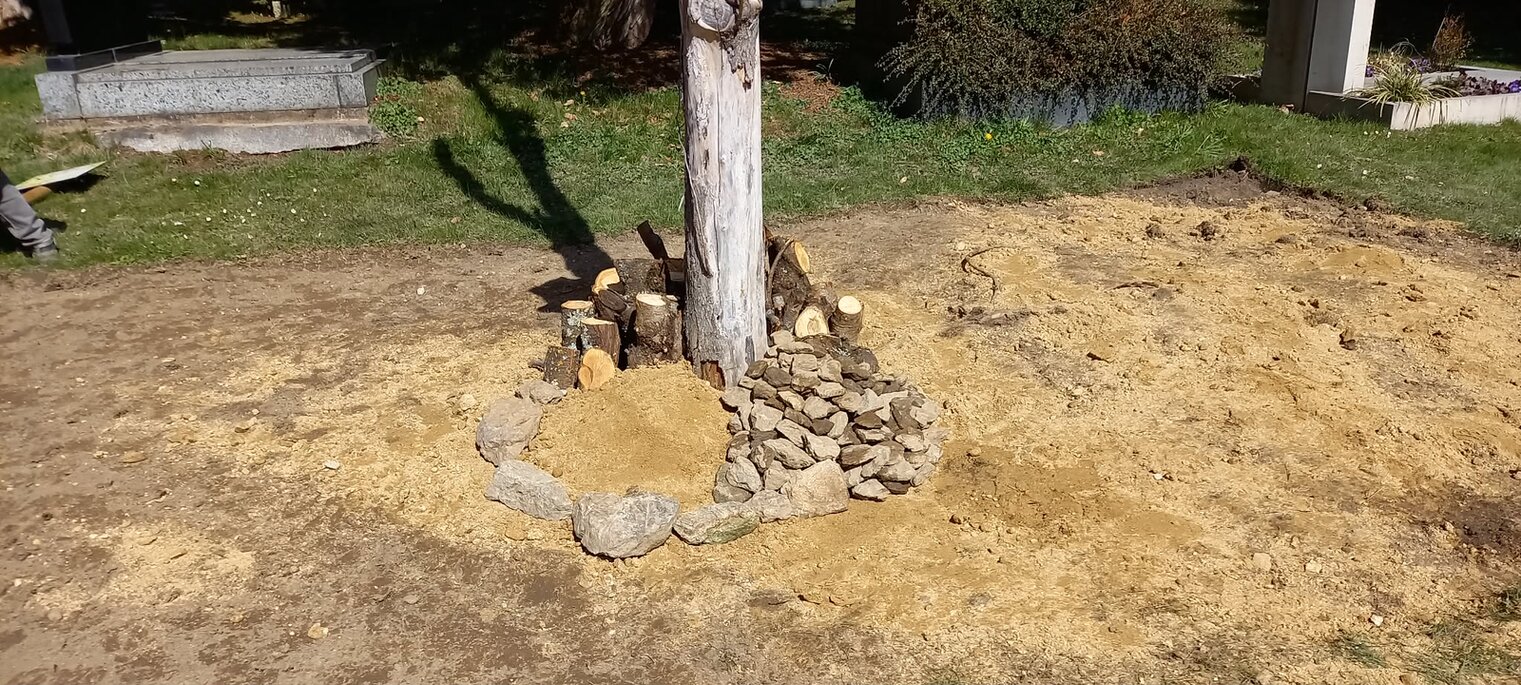 Wir haben hier im Ort auf dem Friedhof etwas angelegt, das eine Lebensinsel werden soll. Da die Entscheider sehr konservativ sind, musste es ordentlich aussehen und ist leider nur sehr klein, aber kann man nichts machen. Es war zuerst nur eine Blumenwiese gewünscht und ich habe das Mittelteil mit Totholz, Steinen und Sand ein bisschen untergejubelt, mit Zustimmung des Pfarrers.