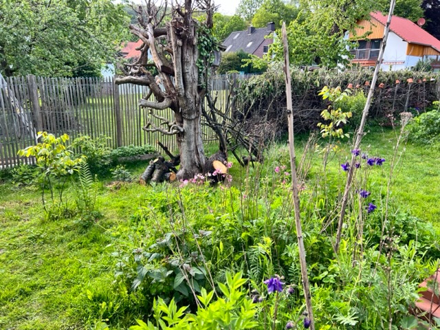 Eine große alte Thuja wurden geköpft, die Hornissen haben dem teilweise schon rottem Stamm dieses Jahr schon viel Material entnommen. Dieser bleibt als Totholzskulptur stehen und wird von Efeu und einer ungefüllten Kletterrose berankt.